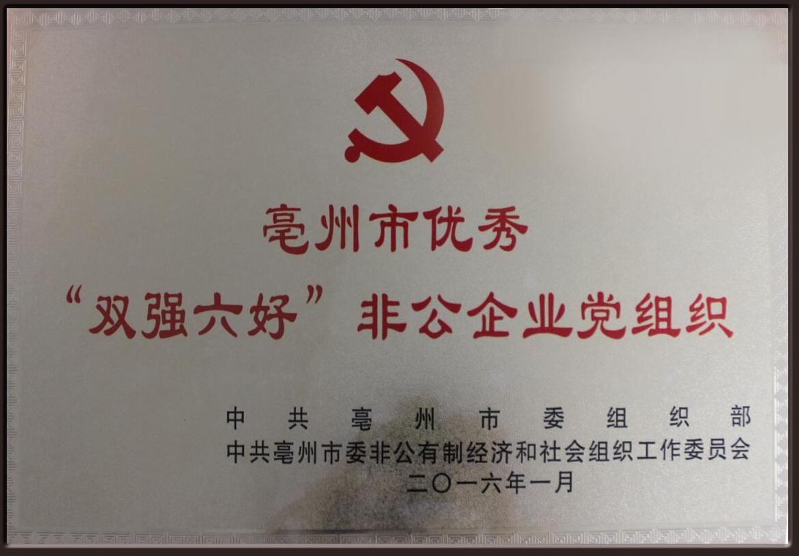 中共亳州市委組織部下發(fā)通知,授予安徽謂博藥業(yè)集團(tuán)優(yōu)秀“雙強(qiáng)六好”非公企業(yè)黨組織榮譽(yù)稱號(hào)。雙強(qiáng)六好是指非公有制企業(yè)和社會(huì)組織雙強(qiáng):發(fā)展強(qiáng)、黨建強(qiáng);六好:生產(chǎn)經(jīng)營好、企業(yè)文化好、勞動(dòng)關(guān)系好、黨組織班子好、黨員隊(duì)伍好、社會(huì)反映好。