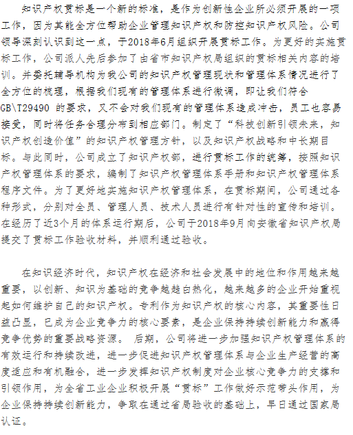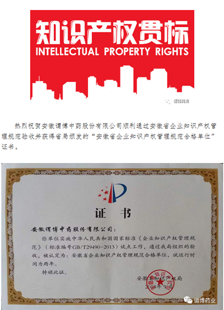 謂博榮獲“安徽省企業(yè)知識產(chǎn)權(quán)管理規(guī)范合格單位”證書